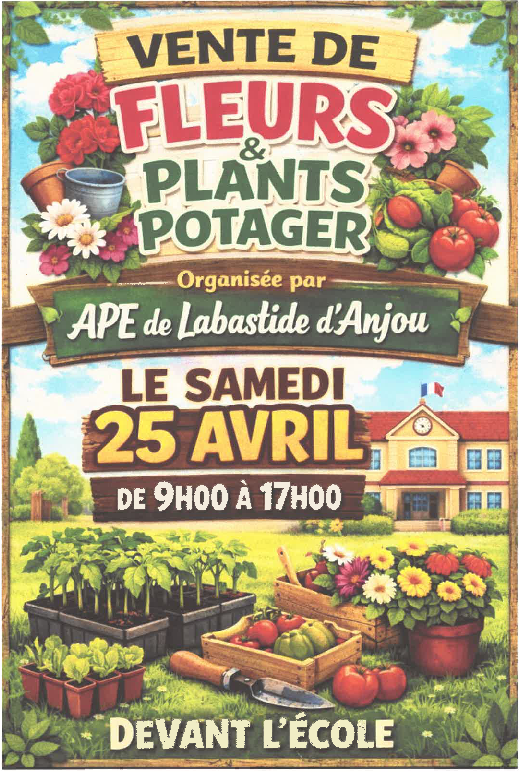 APE Labastide d’Anjou – Vente de fleurs Publié par Webmaster Airoux le 15 avril 2026 L’Association des Parents d’Élèves de Labastide d’Anjou organise une vente de fleurs et plants potager le samedi 25 avril 2026 de 09h à 17h devant l’école. Lire la suite Article précédent Carnaval des enfants