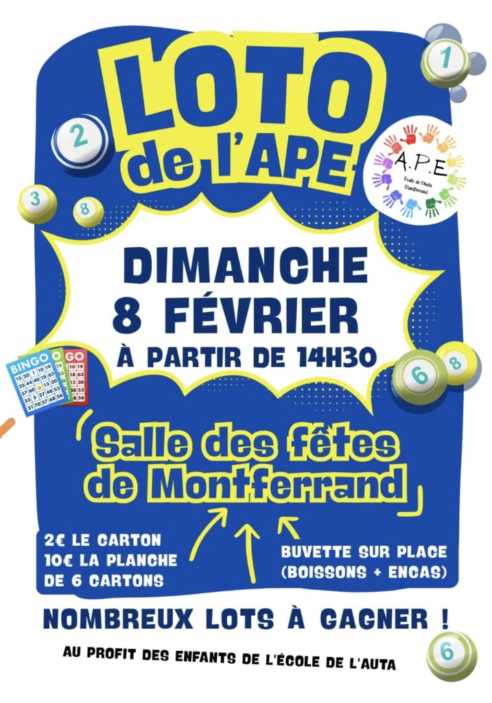 Loto de l’APE Publié par Webmaster Airoux le 20 janvier 2026 L’Association des Parents d’Élèves de l’école Airoux-Montferrand vous invite à participer à un loto le dimanche 08 février 2026 à la salle des fêtes de Montferrand. Ouverture de la salle à partir de 13h30, début du loto à 14h30. Lire la suite Article précédent Appel à bénévoles (lecture)